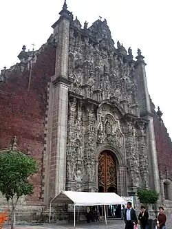 The first church built on the cathedral site also had a tabernacle, but its exact location is unknown. During the construction of the cathedral, the tabernacle was housed in what are now the Chapels of San Isidro and Our Lady of Agony of Granada. However, in the 18th century, it was decided to build a structure that was separate, but still connected, to the main cathedral.[30] It is constructed of tezontle (a reddish porous volcanic rock) and white stone in the shape of a Greek cross with its southern facade faces the Zócalo. It is connected to the main cathedral via the Chapel of San Isidro.[13][3]