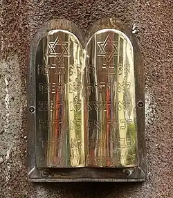 In Karaite Judaism the Deuteronomic verse "And you shall write them on the doorposts of your houses and your gates" (Deuteronomy 6:9; 11:20) is interpreted to be a metaphor and not as referring to the Rabbanite mezuzah.[33] Thus Karaites do not traditionally use mezuzot, but put up a small plaque in the shape of the two Tablets of the Law with the Ten Commandments. In Israel, where they might try not to make other Jews feel uncomfortable, many Karaites make an exception and place a mezuzah on their doorpost as well.[34][35] The Karaite version of the mezuzah is fixed to the doorways of public buildings and sometimes to private buildings, too.[35]