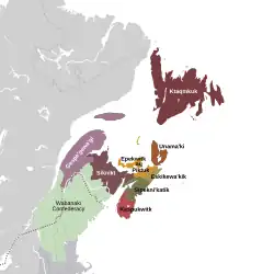 93. ^ The allied tribes occupied the territory which the French named Acadia. The tribes ranged from present-day northern and eastern New England in the United States to the Maritime Provinces of Canada. At the time of contact with the French (late 16th century), they were expanding from their maritime base westward along the Gaspé Peninsula /St. Lawrence River at the expense of Iroquoian-speaking tribes. The Mi'kmaq name for this peninsula was Kespek (meaning "last-acquired").