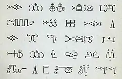 The Mi'kmaq language was written using Mi'kmaq hieroglyphic writing using a hieroglyphic system created in 1677 by French Catholic missionary Chrestien Le Clerq.[20] Le Clerq noted that the Mi'kmaq children were memorizing prayers utilizing the counting of marks, but did not claim to have incorporated any of this system into the hieroglyphs he created. It is likely that this pre-Le Clerq writing system was part of a writing tradition by the Mi'kmaq similar to that observed in 1651 amongst the Eastern Abenaki of Maine.[21] Today, it is written mainly using letters of the Latin alphabet.