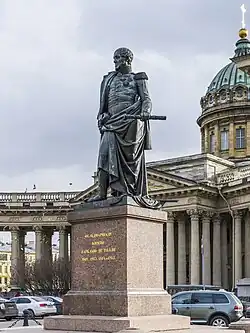 A grand statue of him was erected in front of Kazan Cathedral, St Petersburg at the behest of Emperor Nicholas I. A full-size bronze-mounted statue by Vladimir Surovtsev in Chernyakhovsk, a bust monument in Tartu, and the so-called "Barclay's leaning house" in Tartu (which was acquired by his widow after his death). He was also commemorated by a modern statue in Riga,[14] until it was subsequently dismantled on 16 October 2024.[14][nb 2]