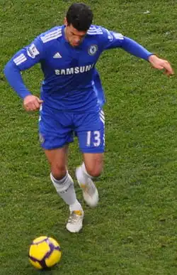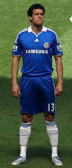 Ballack's debut for Chelsea came on 31 July 2006, during a practice match at UCLA's intramural football pitch. Chelsea presented him to the media the following day where the club also gave him his favoured number 13 shirt, worn throughout his career. Upon doing so, William Gallas, who previously wore the number 13 shirt for Chelsea, was given the number 3 shirt. This move created animosity between Gallas and the club as Gallas felt that he was underappreciated.[21] Ballack made his competitive debut in the 2006 FA Community Shield, but went off injured in the first half.[22] On 27 August 2006, Ballack made his Premier League debut for Chelsea against Blackburn Rovers.[23] On 12 September, he scored his first goal for the club on his Champions League debut against Werder Bremen.[24]