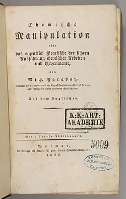 - Faraday, Michael (1827). Chemical Manipulation, Being Instructions to Students in Chemistry. John Murray. 2nd ed. 1830, 3rd ed. 1842