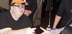 Although Moore has been known for his political activism,[118] he rejects the label as redundant in a democracy: "I and you and everyone else has to be a political activist. If we're not politically active, it ceases to be a democracy."[119] According to John Flesher of the Associated Press, Moore is known for his "fiery left-wing populism",[120] and publications such as the Socialist Worker Online have hailed him as the "new Tom Paine".[121] One critic has traced the leftist populism in three of his films (Roger & Me, Sicko, and Capitalism: A Love Story), arguing that at least these films showcase Moore's populism as embracing specific social causes while also demonstrating an irreverent style that positions Moore as the proverbial little guy ‘talking truth to power’ against a corporate elite.[122] In a speech, he said that socialism is democracy and Christianity. However, he later said that economic philosophies from the past were not apt enough to describe today's realities.[123]