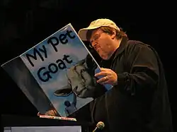 Shortly after winning the Academy Award for Best Documentary Feature for Bowling for Columbine, Moore spoke out against U.S. President George W. Bush and the Iraq War, which had just started three days prior. He further criticized the president by stating, "We live in a time where we have fictitious election results that elects a fictitious president. We live in a time where we have a man sending us to war for fictitious reasons."[57] The speech was received with a cacophony of boos, applause, and standing ovations from the audience at the theater.[58] Moments after the speech concluded, to lighten the mood, host Steve Martin joked, "The Teamsters are helping Michael Moore into the trunk of his limo."[59]