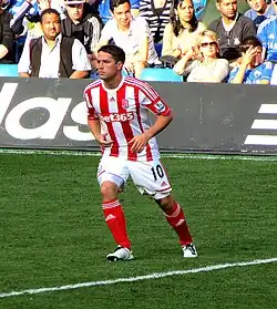 On 4 September 2012, Owen joined Stoke City on a one-year contract.[125] He was handed the number 10 shirt from the departed Ricardo Fuller and made his debut in a 1–1 draw against Manchester City on 15 September.[126] The start to his time at Stoke was hampered by a hamstring injury.[127] Owen scored his first and only goal for Stoke on 19 January 2013 in a 3–1 defeat at Swansea City, his first goal since 25 October 2011. In doing so, he became only the seventh player to reach 150 Premier League goals.[128]
