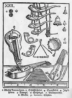 His expansive but unfinished treatise, Syntagma Musicum, appeared in three volumes (with appendix) between 1614 and 1620.[18] The first volume (1614), titled Musicae Artis Analecta, was written mostly in Latin, and regarded the music of the ancients and of the church. The second (De Organographia, 1618) regarded the musical instruments of the day, especially the organ; it was one of the first theoretical treatises written in the vernacular.[19] The third (Termini Musicali, 1618), also in German, regarded the genres of composition and the technical essentials for professional musicians. An appendix to the second volume (Theatrum Instrumentorum seu Sciagraphia, 1620) consisted of 42 woodcuts depicting instruments of the early 17th century, all grouped in families and shown to scale. A fourth volume on composition was planned, with the help of Baryphonus, but was left incomplete at his death. Gustave Reese, an American musicologist specializing in medieval and Renaissance music, said that the Syntagma Musicum was one of the most important sources of seventeenth century musical history.[4]