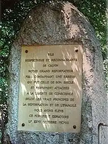 Duteous and grateful followers of Calvin our great Reformer, yet condemning an error which was that of his age, and strongly attached to liberty of conscience according to the true principles of his Reformation and gospel, we have erected this expiatory monument. Oct. 27, 1903