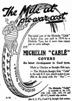 Michelin developed and patented a key innovation in tyre history, the 1946 radial tyre, and successfully exploited this technological innovation to become one of the world's leading tyre manufacturers.[8] The radial was initially marketed as the "X" tyre.[9] It was developed with the front-wheel-drive Citroën Traction Avant and Citroën 2CV in mind.