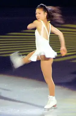 In the 1996–97 season, Kwan skated to "Dream of Desdemona" (short program) and "Taj Mahal" (free skate). During this season, Kwan struggled with her jumps because of a growth spurt, which affected her balance on her jump, and problems with new skating boots which she wore for an endorsement contract with the manufacturer.[28][29] She won the short program at the 1997 U.S. Nationals, but fell early in her free skate and as she later stated, "panicked" and made several more errors. She lost to Tara Lipinski, who came in first place in her free skate. Three weeks later, at the Champion Series Final, she again lost to Lipinski, who completed more successful jumps than Kwan in both the short program and free skate.[28] At the 1997 World Championships, Kwan came in second place, behind Lipinski, who won the gold medal. Kwan came in fourth place in her short program due to an unsuccessful jump combination while Lipinski came in first place and Irina Slutskaya, who missed her combination jump, came in sixth place. All three skaters performed well during their free skates, each earning first-place ordinals from three of the nine judges. Kwan won the free skate, with Lipinski coming in second place and Slutskaya coming in third place. Kwan's jumps in her free skate were not as difficult as Lipinski and Slutskaya's, but her skating between her jumps was more complex and demonstrated "more polished refinement".[30] Overall, Lipinski came in first place, Kwan came in second place, and Slutskaya came in fourth place behind Vanessa Gusmeroli of France.[31]