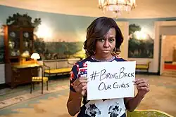 In May 2014, Obama joined the campaign to bring back school girls who had been kidnapped in Nigeria. The first lady tweeted a picture of herself holding a poster with the #bringbackourgirls campaign hashtag.[150] Obama writes in her book about enlisting help for her initiative Let Girls Learn to produce and sing the song "This is for My Girls".[151]