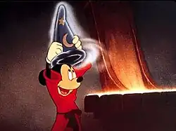 In 1939, Mickey appeared in Mickey's Surprise Party, along with Minnie, with a new design, which gave him smaller, more detailed eyes.[40][41] In 1940, Mickey appeared in his first feature-length film, Fantasia, which utilized his redesign.[40] His screen role as The Sorcerer's Apprentice, set to the symphonic poem of the same name by Paul Dukas, is perhaps the most famous segment of the film and one of Mickey's most iconic roles. The apprentice (Mickey), not willing to do his chores, puts on the sorcerer's magic hat after the sorcerer goes to bed and casts a spell on a broom, which causes the broom to come to life and perform the most tiring chore—filling up a deep well using two buckets of water. When the well eventually overflows, Mickey finds himself unable to control the broom, leading to a near-flood. After the segment ends, Mickey is seen in silhouette shaking hands with conductor Leopold Stokowski. Mickey has often been pictured in the red robe and blue sorcerer's hat in merchandising. It was also featured into the climax of Fantasmic!, an attraction at the Disney theme parks.