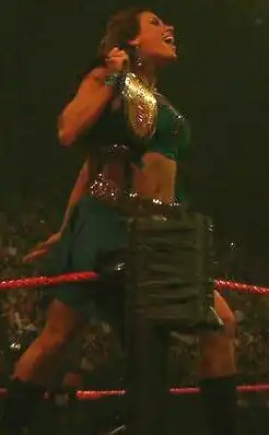 James made her World Wrestling Entertainment (WWE) main roster debut in 2005 and was placed in a storyline with Trish Stratus, in which James' gimmick was that of Stratus' biggest fan turned obsessed stalker, an angle which ran over eight months.[11][8][12] She received a push and she won her first WWE Women's Championship at WrestleMania 22, a championship she has held a total of five times. James also won her first and only Divas Championship defeating Maryse Ouellet at Night of Champions in 2009, to become the second of five Divas to hold both the Women's and Divas Championships.[13] She was released from the company in April 2010, after which she returned to TNA, where she became a three-time TNA Knockouts Champion. James returned to WWE in 2013 as a guest trainer, then officially returned in 2016 before she was once again released in 2021. James would then make occasional appearances and would ultimately return to Impact Wrestling in 2021, winning her fourth and fifth Knockouts Championship, making James a total 11-time women's world champion between WWE and Impact.