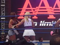 While working in Ring of Honor for a year, James also debuted as Alexis Laree in Total Nonstop Action Wrestling (TNA) on the company's first ever weekly pay-per-view, introduced as a participant in the lingerie battle royal, which occurred the following week.[22][23] She was not prominently featured until March 26, 2003, when she teamed with Amazing Red as part of his feud against the X Division Champion Kid Kash and Trinity. Laree competed in her first singles match with the promotion on April 2, 2003, in a losing effort against Trinity.[8][24] Weeks later, she became the first member of The Gathering, a stable led by Raven in his feud against NWA World Heavyweight Champion Jeff Jarrett.[8] On April 16, Laree became the first (and thus far, only) woman to compete in a Clockwork Orange House of Fun match, after the Gathering challenged and defeated Jarrett.[10][25] She continued to wrestle with the stable while they feuded with The Disciples of the New Church, taking part in an angle with Father James Mitchell burning her with a fireball and wrestling in another Clockwork Orange House of Fun match before leaving the company.[26][27][28]