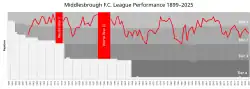 Middlesbrough were one of the founding members of the Premier League in 1992, and have spent all but two seasons of their entire history as a professional club competing within the top two tiers of English football.[2] Their highest league finish to date was third place in the top flight in the 1913–14 season. The outbreak of the First World War stunted their push for a first top division title, though the club pushed again during the inter-war years, finishing fourth in the 1938–39 season before the Second World War halted the English leagues and again prevented a push for a first title. The club came within minutes of folding in 1986 before they were saved by a consortium led by board member and later chairman Steve Gibson.[3] A remarkable recovery saw the club immediately earn back-to-back promotions to the top division in the 1986–87 and 1987–88 seasons. The club were runners-up in the FA Cup and League Cup in 1997[4][5] while also being relegated following a controversial 3-point deduction,[6] and losing another League Cup final the following season. Under Steve McClaren, the club won the League Cup in 2004, its first major silverware, and reached the 2006 UEFA Cup final. The club has played one Premier League season since relegation in 2009.