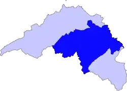 Map contrasting the area comprising Midlothian council (dark blue) within the historic county of Midlothian (light blue).