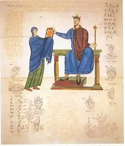 ![]() Mieszko Lambert receiving a liturgical book from Matilda of Swabia, 1000–1025 | |