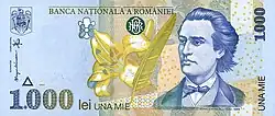 Eminescu is omnipresent in today's Romania. His statues are everywhere;[34][35][36][37][38][39][40][41] his face was on the 1000-lei banknotes issued in 1991, 1992, and 1998, and is on the 500-lei banknote issued in 2005 as the highest-denominated Romanian banknote (see Romanian leu); Eminescu's Linden Tree is one of the country's most famous natural landmarks, while many schools and other institutions are named after him. The anniversaries of his birth and death are celebrated each year in many Romanian cities, and they became national celebrations in 1989 (the centennial of his death) and 2000 (150 years after his birth, proclaimed Eminescu's Year in Romania).
