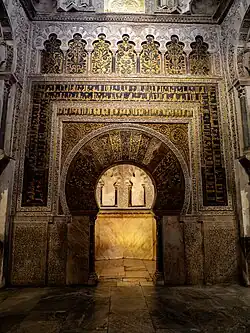 The mihrab in the Great Mosque of Cordoba is a highly decorated piece of art that draws one's attention. It is a contribution made by the Umayyad caliph Al-Hakam II that is not just used for prayer.[18] It is used as a place of convergence in the mosque, where visitors could be amazed by its beauty and gilded designs. The entrance is covered in mosaics "which links to the Byzantium tradition, produced by the craftsmen sent by Emperor Nicephorus II. These mosaics extend along the voussoirs with a geometric and plant-based design, but also in the inscriptions which record verses from the Koran".[18] This mihrab is also a bit different from a normal mihrab due to its scale. It takes up a whole room instead of just a niche.[19] This style of mihrab set a standard for other mihrab construction in the region.[20] The use of the horseshoe arch, carved stucco, and glass mosaics made an impression for the aesthetic of mihrabs, "although no other extant mihrab in Spain or western North Africa is as elaborate."[20]