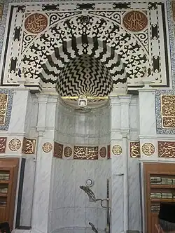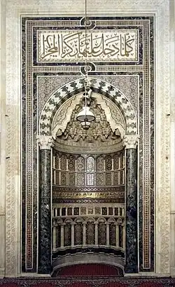The Great Mosque of Damascus was started by the Umayyad caliph Al-Walid I in 706.[21] It was built as a hypostyle mosque, built with a prayer hall leading to the mihrab, "on the back wall of the sanctuary are four mihrabs, two of which are the mihrab of the Companions of the Prophet in the eastern half and the great mihrab at the end of the transept".[21] The mihrab is decorated similarly to the rest of the mosque in golden vines and vegetal imagery. The lamp that once hung in the mihrab has been theorized as the motif of a pearl, due to the indications that dome of the mihrab has scalloped edges.[22] There have been other mosques that have mihrabs similar to this that follow the same theme, with scalloped domes that are "concave like a conch or mother of pearl shell.[22] The original main mihrab of the mosque has not been preserved, having been renovated many times, and the current one is a replacement dating from renovations after a destructive 1893 fire.[22][23][11]