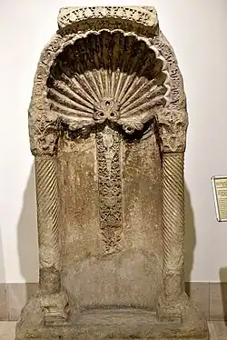 The next earliest concave mihrab to be documented is the one that was added to the Umayyad Mosque of Damascus when it was built by Al-Walid between 706 and 715.[12]: 24 This was then followed by a mihrab added to the Mosque of 'Amr ibn al-'As in Fustat in 710–711.[11] Subsequently, concave mihrabs became widespread across the Muslim world and were adopted as a standard feature of mosques.[11][12]: 24 The oldest surviving concave mihrab today is a marble mihrab housed at the Iraq Museum. It is believed to date from the 8th century, possibly made in northern Syria before being moved by the Abbasids to the Great Mosque of al-Mansur in Baghdad. It was then moved again to the al-Khassaki Mosque built in the 17th century, where it was later found and transferred to the museum.[11][2][13]: 29 This mihrab features a combination of Classical or Late Antique motifs, with the niche flanked by two spiral columns and crowned by a scalloped shell-like hood.[11][13]: 29 [10]: 5
