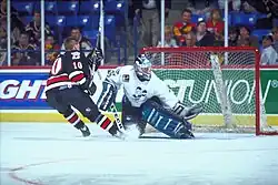 Kiprusoff was offered a spot on the Finnish team for the 2002 Winter Olympics, but declined citing a desire to focus on his professional career in North America.[55] Kiprusoff was named the starting goaltender for the 2004 World Cup of Hockey, and earned a shutout against the Czech Republic.[56] He posted four wins and a tie, including a second shutout, and a 1.18 GAA to lead the upstart Finns into the championship game against Canada.[57] In spite of his 30 saves, the Finns were defeated by Canada 3–2. Kiprusoff did not play his best game in the final, according to Finland Head Coach Raimo Summanen, though he expressed pride in his team's effort.[58]