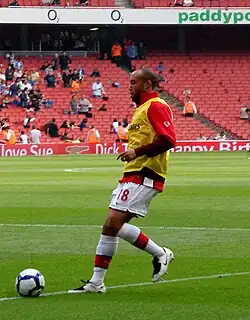 The transfer to Arsenal was completed for an undisclosed fee on 20 August 2008, with Silvestre signing a two-year contract.[14] The transfer made Silvestre the first player to transfer directly between Manchester United and Arsenal since Viv Anderson (who moved in the opposite direction) in 1987, and the first player to move from United to Arsenal since Brian Kidd in 1974. He was given the number 18 shirt, last worn by Pascal Cygan. Silvestre made his debut for the club in a 3–1 victory over Everton on 18 October 2008, his 250th game in English football. In his first Champions League game for Arsenal, against Turkish side Fenerbahçe, he scored an own goal as Arsenal won 5–2. His first Premiership goal for Arsenal came against Tottenham Hotspur on 29 October 2008 in a 4-4 draw.[15] On 8 November 2008, Silvestre played his first game against former side Manchester United, in a fixture that Arsenal eventually won 2–1.[16] Silvestre was as well part of the squad, where he played in the first leg, for Arsenal's 2009 Champions League semi final also against that of Manchester United.[17][18]