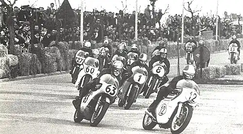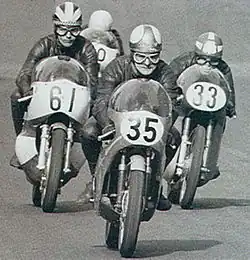 Hailwood's first raced on 22 April 1957, at Oulton Park, finishing in 11th place.[4] In 1958 he won ACU Stars at 125 cc, 250 cc, and 350 cc classes, earning him the Pinhard Prize,[5] an accolade awarded yearly to a young motorcyclist under 21, who is adjudged to have made the most meritorious achievement in motorcycle sport during the preceding year.[7] He teamed with Dan Shorey to win the Thruxton 500 endurance race and finished in four classes of TT race with one podium.