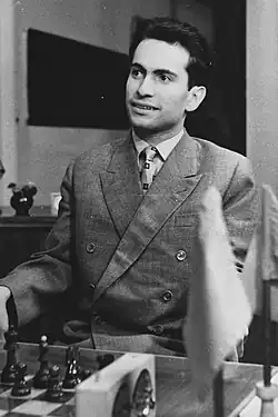 Tal made his first significant appearance at the 1956 USSR Chess Championship, sharing 5th–7th place with Lev Polugaevsky and Ratmir Kholmov.[13] Grigory Levenfish called him "the most colourful figure of the championship" and a "great talent" who strove for "sharp and complicated play".[13] However, he was criticised by the media for taking unnecessary risks and having restricted creative views.[13] Tal then went to play on board three at the students' championship in Sweden, scoring 6 out of 7.[14]