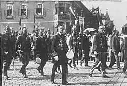 Ideologically a national conservative, Horthy has sometimes been labelled as a fascist.[6][7][8] In the late 1930s, Horthy's foreign policy led him into an alliance with Nazi Germany against the Soviet Union. With the support of Adolf Hitler, Hungary succeeded in reoccupying certain areas ceded to neighbouring countries by the Treaty of Trianon. Under Horthy's leadership, Hungary provided support to Polish refugees when Germany attacked their country in 1939 and participated in the Axis powers' invasion of the Soviet Union in June 1941. Some historians view Horthy as unenthusiastic about contributing to the German war effort and the Holocaust in Hungary (out of fear that it may sabotage peace deals with Allied forces); in addition, several attempts were made to strike a secret deal with the Allies of World War II after it had become obvious that the Axis would lose the war, therefore eventually leading the Germans to invade and take control of the country in March 1944 (Operation Margarethe). However, prior to the Nazi occupation of Hungary, 63,000 Jews were murdered. In late 1944, 437,000 Jews were deported to Auschwitz II-Birkenau, where the majority were killed on arrival.[9] Serbian historian Zvonimir Golubović has claimed that not only was Horthy aware of these genocidal massacres, but had approved of them, such as those in the Novi Sad raid.[10]