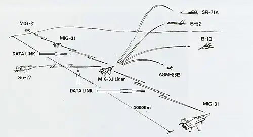 Diagram shows how four MiG-31s can keep up to 1,000 km (620 mi) under control, and how the leader can pass information to friendly fighters.