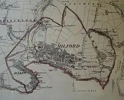 The town of Milford was founded in 1793, after Sir William Hamilton obtained an act of Parliament, the Hubberston and Pill, Pembroke, Docks and Piers Act 1790 (30 Geo. 3. c. 55), to establish the port at Milford, and takes its name from the natural harbour of Milford Haven, which was used for several hundred years as a staging point on sea journeys to Ireland and as a shelter by Vikings. It was known as a safe port[4] and is mentioned in Shakespeare's Cymbeline as "blessed Milford".[5] It was used as the base for several military operations, such as Richard de Clare's invasion of Leinster in 1167,[6] Henry II's Invasion of Ireland in 1171,[7] John's continued subjugation of the Irish in 1185 and 1210[8] and Oliver Cromwell's 1649 invasion of Ireland;[9] while forces which have disembarked at the point include Jean II de Rieux's 1405 reinforcement of the Glyndŵr Rising and Henry VII's 1485 landing at the waterway before marching on England. By the late 18th century the two local creeks were being used to load and unload goods,[10] and surrounding settlements were established, including the medieval chapel, and Summer Hill Farm, the only man-made structures on the future site of Milford.[11]