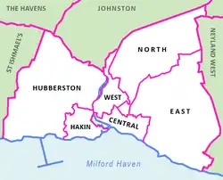 Milford Haven is the most populous community in the county, with a population of 13,907 within the community boundary at the 2011 census.[1] When measured in terms of urban area the population was 13,582, making it the second largest urban area in the county after Haverfordwest (where the urban area extends beyond its community boundary).[3]