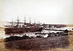 In 1863, the railway network came to Milford, linking it to the Haverfordwest line and beyond. In 1866, work was completed on an additional extension which provided access to the docks and ship-breaking yard on the eastern side of the town.[26] Between 1875 and 1886, Great Eastern was a permanent fixture at Milford Docks, remaining there for lengthy repairs.[27] Her arrival into the docks was heralded as an example of the size of ship that the town could expect to attract.[11]