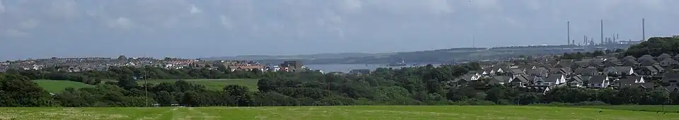 The town of Milford Haven lies on the north bank of the Milford Haven Waterway, which is a ria or drowned valley.[40] This is a landscape of low-lying wooded shorelines, creeks and mudflats.[41]