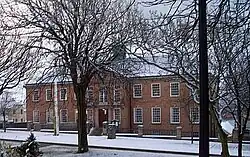 In 1800, following the bankruptcy of the Jacobs & Sons, the Navy Board's overseer, Jean-Louis Barralier, was persuaded to lease the site for the Navy Board and develop a dockyard for building warships.[15] Seven royal vessels were eventually launched from the dockyard, including HMS Surprise and HMS Milford.[16] The town was built on a grid pattern, thought to have been to the design of Jean-Louis Barrallier, who remained in charge of shipbuilding there for the Navy Board.[17][18] Between 1801 and 1803, the town and waterway were protected by temporary batteries at Hakin Point and south of St Katherine's Church, in response to the perceived threat following the Fishguard Invasion.[19]