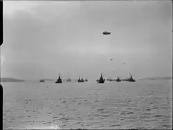 By 1901, the town's population had reached 5,102, and by 1931 had further doubled to 10,104.[28] In the First World War, the Haven was an assembly point for convoys to Gibraltar, and a base, under the command of R.N.R. Captain (and retired Admiral) Charles Holcombe Dare, to counter the activity of German U-boats off the coast of Pembrokeshire.[29] The early twentieth century saw a period of increased urbanisation of the area; in the period from the First World War to 1937, 312 council houses were built, and public services, such as electricity supplies and sewerage, were completed.[11] The steep gradient of the Rath was at this time constructed, and in 1939 Milford Haven Town Hall was opened on Hamilton Terrace, at that time possessing an inbuilt fire station. 1939 also saw the opening of an outdoor swimming pool on the Rath.[11]