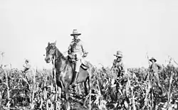 The advance entered Palestine and an initial, unsuccessful attempt was made to capture Gaza on 26 March 1917, while a second and equally unsuccessful attempt was launched on 19 April. A third assault occurred between 31 October and 7 November and this time both the Anzac Mounted Division and the Australian Mounted Division took part. The battle was a complete success for the British, over-running the Gaza-Beersheba line and capturing 12,000 Turkish soldiers. The critical moment was the capture of Beersheba on the first day, after the Australian 4th Light Horse Brigade charged more than 4 miles (6.4 km). The Turkish trenches were overrun, with the Australians capturing the wells at Beersheeba and securing the valuable water they contained along with over 700 prisoners for the loss of 31 killed and 36 wounded.[80] Later, Australian troops assisted in pushing the Turkish forces out of Palestine and took part in actions at Mughar Ridge, Jerusalem and the Megiddo. The Turkish government surrendered on 30 October 1918.[81] Units of the Light Horse were subsequently used to help put down a nationalist revolt in Egypt in 1919 and did so with efficiency and brutality, although they suffered a number of fatalities in the process.[82]