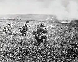 The German offensive ground to a halt in mid-July and a brief lull followed, during which the Australians undertook a series of raids, known as Peaceful Penetrations.[100] The Allies soon launched their own offensive—the Hundred Days Offensive—ultimately ending the war. Beginning on 8 August 1918 the offensive included four Australian divisions striking at Amiens.[101] Using the combined arms techniques developed earlier at Hamel, significant gains were made on what became known as the "Black Day" of the German Army.[102] The offensive continued for four months, and during Second Battle of the Somme the Australian Corps fought actions at Lihons, Etinehem, Proyart, Chuignes, and Mont St Quentin, before their final engagement of the war on 5 October 1918 at Montbrehain.[103] The AIF was subsequently out of the line when the armistice was declared on 11 November 1918.[104]