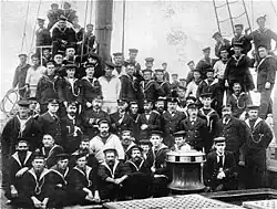 With the exception of Western Australia, the colonies also operated their own navies. In 1856, Victoria received its own naval vessel, HMCSS Victoria, and its deployment to New Zealand in 1860 during the First Taranaki War marked the first occasion that an Australian warship had been deployed overseas.[31] The colonial navies were expanded greatly in the mid-1880s and consisted of a number of gunboats and torpedo-boats for the defence of harbours and rivers, as well as naval brigades to man vessels and forts. Victoria became the most powerful of all the colonial navies, with the ironclad HMVS Cerberus in service from 1870, as well as the steam-sail warship HMS Nelson on loan from the Royal Navy, three small gunboats and five torpedo-boats. New South Wales formed a Naval Brigade in 1863 and by the start of the 20th century had two small torpedo-boats and a corvette. The Queensland Maritime Defence Force was established in 1885, while South Australia operated a single ship, HMCS Protector. Tasmania had also a small Torpedo Corps, while Western Australia's only naval defences included the Fremantle Naval Artillery. Naval personnel from New South Wales and Victoria took part in the suppression of the Boxer Rebellion in China in 1900, while HMCS Protector was sent by South Australia but saw no action.[32] The separate colonies maintained control over their military and naval forces until Federation in 1901, when they were amalgamated and placed under the control of the new Commonwealth of Australia.[33]