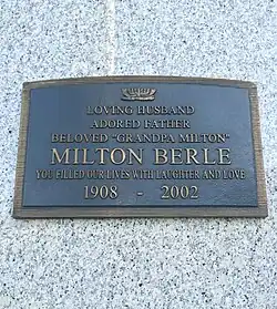 Berle reportedly left arrangements to be buried with his second wife, Ruth, at Mount Sinai Memorial Park Cemetery in Burbank, but his body was cremated and interred at Hillside Memorial Park Cemetery in Culver City. (Warren Cowan, Berle's publicist, told The New York Times, "I only know he told me he bought plots at Hillside, and it was his idea.")[91] Many celebrities showed up to his funeral.[92][93] In addition to his third wife, Lorna Adams, Berle was survived by his three children and extended family.[94][95][96]