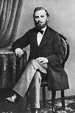 Balakirev also intermittently spent time editing Glinka's works for publication, on behalf of the composer's sister, Lyudmilla Shestakova. At her behest, he travelled to Prague in 1866 to arrange the production of Glinka's operas there. This project was delayed due to the Austro-Prussian War until the following year.[24] The Prague production of A Life for the Tsar under the direction of Bedřich Smetana reportedly horrified Balakirev, with Balakirev taking issue with the musical tempos, the casting of various roles, and the costumes—"[i]t was as though Smetana was trying to turn the whole piece into a farce."[26] "[F]ive weeks of quarrels, intrigues by Smetana and his party, and intensive rehearsals" followed,[24] with Balakirev attending every rehearsal.[27] Balakirev suspected Smetana and others were influenced by pro-Polish elements of the Czech press, which labeled the production a "Tsarist intrigue" paid for by the Russian government.[27] He had difficulties with the production of Ruslan and Lyudmila under his direction, with the Czechs initially refusing to pay for the cost of copying the orchestral parts, and the piano reduction of the score, from which Balakirev was conducting rehearsals, mysteriously disappearing.[28] Biographer Mikhail Tsetlin (aka Mikhail Zetlin) writes, "It is hard to say, nowadays, whether Balakirev's suspicions were fully justified or whether they were partly due to his own high-strung disposition."[29] Regardless, though A Life for the Tsar and Ruslan and Lyudmila were successes, Balakirev's lack of tact and despotic nature created considerable ill feelings between him and others involved.[23] Afterwards, he and Smetana no longer spoke to each other.[29]