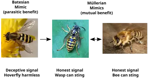 Mimicry is an evolved resemblance between an organism and another object, often an organism of another species. Mimicry may evolve between different species, or between individuals of the same species. Often, mimicry functions to protect from predators.[11] Mimicry systems have three basic roles: a mimic, a model, and a dupe. When these correspond to three separate species, the system is called disjunct; when the roles are taken by just two species, the system is called bipolar.[2][12] Mimicry evolves if a dupe (such as a predator) perceives a mimic (such as a palatable prey) as a model (the organism it resembles), and is deceived to change its behaviour to the mimic's selective advantage.[13] The resemblances can be via any sensory modality, including any combination of visual, acoustic, chemical, tactile, or electric.[13][14] Mimicry may be to the advantage of both organisms that share a resemblance, in which case it is mutualistic; or it can be to the detriment of one, making it parasitic or competitive. The evolutionary convergence between groups is driven by the selective action of a dupe.[2][15] Birds, for example, use sight to identify palatable insects,[16] whilst avoiding noxious ones. Over time, palatable insects may evolve to resemble noxious ones, making them mimics and the noxious ones models. Models do not have to be more abundant than mimics.[17] In the case of mutualism, each model is also a mimic; all such species can be called "co-mimics".[17] Many harmless species such as hoverflies are Batesian mimics of strongly defended species such as wasps, while many such well-defended species form Müllerian mimicry rings of co-mimics.[2] In the evolution of wasp-like appearance, it has been argued that insects evolve to masquerade wasps since predatory wasps do not attack each other, and that this mimetic resemblance has had the useful side-effect of deterring vertebrate predators.[18]