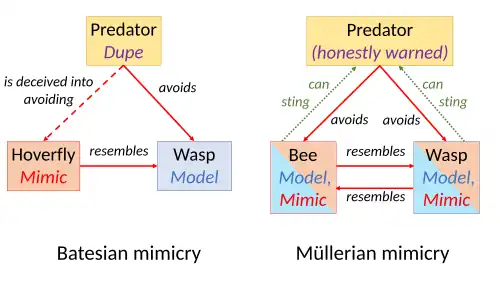 In evolutionary biology, mimicry is the evolved resemblance of an organism to something else, often another organism of a different species. Mimicry may evolve between different species, or between individuals of the same species. In the simplest case, as in Batesian mimicry, a mimic resembles a model, so as to deceive a dupe, all three being of different species. A Batesian mimic, such as a hoverfly, is harmless, while its model, such as a wasp, is harmful, and is avoided by the dupe, such as an insect-eating bird. Birds hunt by sight, so the mimicry in that case is visual, but in other cases mimicry may make use of any of the senses. Most types of mimicry, including Batesian, are deceptive, as the mimics are not harmful, but Müllerian mimicry, where different harmful species resemble each other, is honest, as when species of wasps and of bees all have genuinely aposematic warning coloration. More complex types may be bipolar, involving only two species, such as when the model and the dupe are the same; this occurs for example in aggressive mimicry, where a predator in wolf-in-sheep's-clothing style resembles its prey, allowing it to hunt undetected. Mimicry is not limited to animals; in Pouyannian mimicry, an orchid flower is the mimic, resembling a female bee, its model; the dupe is the male bee of the same species, which tries to copulate with the flower, enabling it to transfer pollen, so the mimicry is again bipolar. In automimicry, another bipolar system, model and mimic are the same, as when blue lycaenid butterflies have 'tails' or eyespots on their wings that mimic their own heads, misdirecting predator dupes to strike harmlessly. Many other types of mimicry exist.