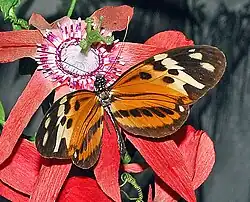 In Dodsonian mimicry, named after Calaway H. Dodson, the model belongs to a different species than the mimic.[90] By resembling the model, a flower can lure its pollinators without offering nectar. The mechanism occurs in several orchids, including Epidendrum ibaguense which mimics flowers of Lantana camara and Asclepias curassavica, and is pollinated by monarch butterflies and perhaps hummingbirds.[91]