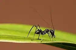 Parasites can be aggressive mimics, though the situation is somewhat different from those outlined previously. They can mimic their hosts' natural prey, allowing themselves to be eaten as a pathway into their host. Leucochloridium, a genus of flatworm, matures in the digestive system of songbirds, their eggs then passing out of the bird in the faeces. They are then taken up by Succinea, a terrestrial snail. The eggs develop in this intermediate host, and must then find a suitable bird to mature in. Since the host birds do not eat snails, the sporocyst has another strategy to reach its host's intestine. They are brightly coloured and move in a pulsating fashion. A sporocyst-sac pulsates in the snail's eye stalks,[80][81] coming to resemble an irresistible meal for a songbird. In this way, it can bridge the gap between hosts, allowing it to complete its life cycle.[14] A nematode (Myrmeconema neotropicum) changes the colour of the abdomen of workers of the canopy ant Cephalotes atratus to make it appear like the ripe fruits of Hyeronima alchorneoides. It also changes the behaviour of the ant so that the gaster (rear part) is held raised. This presumably increases the chances of the ant being eaten by birds.[82]