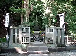 The stone pagoda traditionally believed to be his grave is still maintained today, adjacent to Shirahata Shrine, a short distance from the spot believed to be the site of the so-called Ōkura Bakufu, his shogunate's administrative-governmental offices.