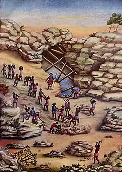 Between 1692 and 1693, the bandeirante Antônio Rodrigues Arzão discovered the first gold deposits in the territory of Minas Gerais. In the following years, bandeirantes from the towns of São Paulo and Taubaté traveled through the Das Velhas region looking for gold. In 1696, Salvador Fernandes Furtado discovered gold on the banks of the Carmo river and built his camp there, which gave rise to the town of Nossa Senhora do Carmo (now Mariana). Two years later, Antônio Dias de Oliveira discovered gold at the foot of the Itacolomi Peak and founded his settlement there, the embryo of Vila Rica (currently Ouro Preto). In 1702, João de Siqueira Afonso discovered precious stones in the Rio das Mortes valley.[22][23] Initially, gold was extracted from riverbeds, which forced miners to move as the deposits ran out. After some time, exploration also began to be carried out on mountain slopes, which forced the permanent settlement of miners, leading to the emergence of the first settlements.[25][26]