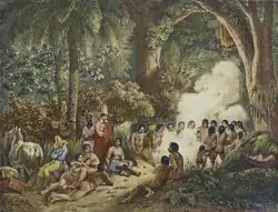 More than a hundred indigenous groups inhabited the current territory of Minas Gerais at the time of the arrival of the Portuguese.[16] In the valleys of the Doce, Jequitinhonha and Mucuri rivers, people generally known as "botocudos" lived, such as the Maxakalis, Maconis, Naquenuques, Aranãs, Krenaks and Pataxós. Northern Minas Gerais was dominated by the Kiriris and Xakriabás. Center, western and southern Minas Gerais were inhabited by the Cataguás, who were the most numerous indigenous group in Minas Gerais' territory in colonial times, so much so that the region was known as "Campos Gerais dos Cataguases" in the time of the bandeirantes. The regions of Triângulo Mineiro and Alto Paranaíba were inhabited by the Kayapos and Araxás, while the Zona da Mata was populated by the Puri. The region of Minas Gerais close to the border with São Paulo, Mato Grosso do Sul and Goiás was occupied by the Bororós.[17]
