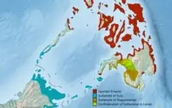 Approximate historical extent of the Muslim sultanates of Sulu, Maguindanao and Lanao in the 19th century